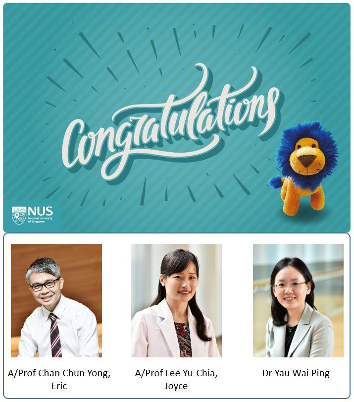 Congratulations to A/Prof Chan Chun Yong, Eric, A/Prof Lee Yu-Chia, Joyce and Dr Yau Wai Ping for winning the NUS Annual Teaching Excellence Award for AY2017/18!