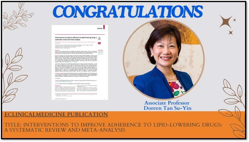 Let’s extend our warm congratulations to Prof Doreen Tan, Deborah Yow Keng Wai, Ang Weijie, Yap Hao Jeun, and the team on their latest publication in eClinicalMedicine, titled ‘Interventions to Improve Adherence to Lipid-Lowering Drugs: A Systematic Review and Meta-Analysis.”