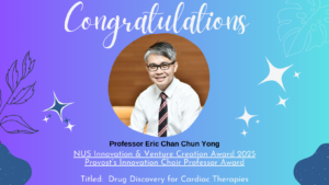 We’re excited to share that Prof Eric Chan Chun Yong’s grant proposal, titled ‘Drug Discovery for Cardiac Therapies’, has been selected for the prestigious Innovation Venture Creation Award, with a total project value of $300,000. In addition, the same project has also earned him the Provost’s Innovation Chair Professor Award, a remarkable dual recognition that highlights the groundbreaking potential of his research.