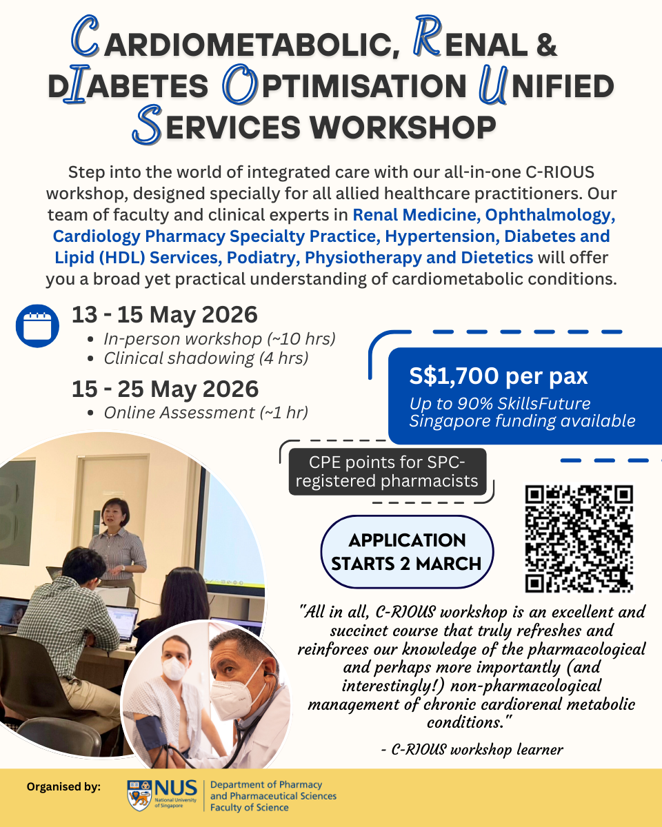 For more information or enquiries, please contact Ms Ng Shi Ying at pharmacy_shortcourses@nus.edu.sg.
