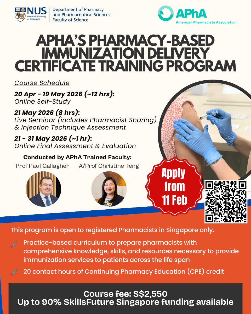 For more information, please contact Ms Ng Shi Ying at pharmacy_shortcourses@nus.edu.sg.